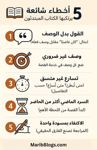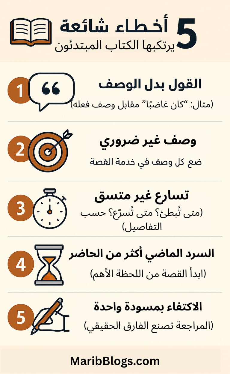 كتابة الروايات ليست مهمة سهلة، وكثير من المبتدئين يقعون في أخطاء متكررة تقلل من تأثير نصوصهم على القارئ. في هذا المقال نسلط الضوء على خمسة من أكثر الأخطاء شيوعًا في كتابة القصص والروايات، مثل الاعتماد على القول بدل الوصف، أو إضافة وصف غير ضروري يضعف السرد، أو تسارع غير متوازن في الأحداث، أو الإفراط