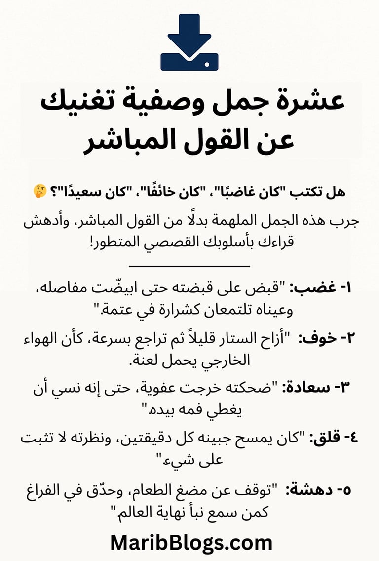يتميز الفن القصصي بكونه صورة للواقع، وفي الحياة الواقعية لا تجد من يهمسك لك في أذنك أن شخصًا ما غاضب، أو أنه متوتر، أو أنه حزين، بل تستنج ذلك من نبرة كلامه، حركاته، قسمات وجهه، تصرفاته، أو ربما منطوقًا في كلمات بطريقة غير مباشرة. إن كتابة القصص والروايات مثل ذلك تمامًا، لا تكتب "كان خائفًا"، بل اكتب وصفًا لتصرفاته الخائفة دون أن تذكر الكلمة بعينها، وإن كنت تستخدم ضمير المتكلم في قص الحكاية يمكنك أن تصف مكونات مشاعره.