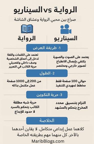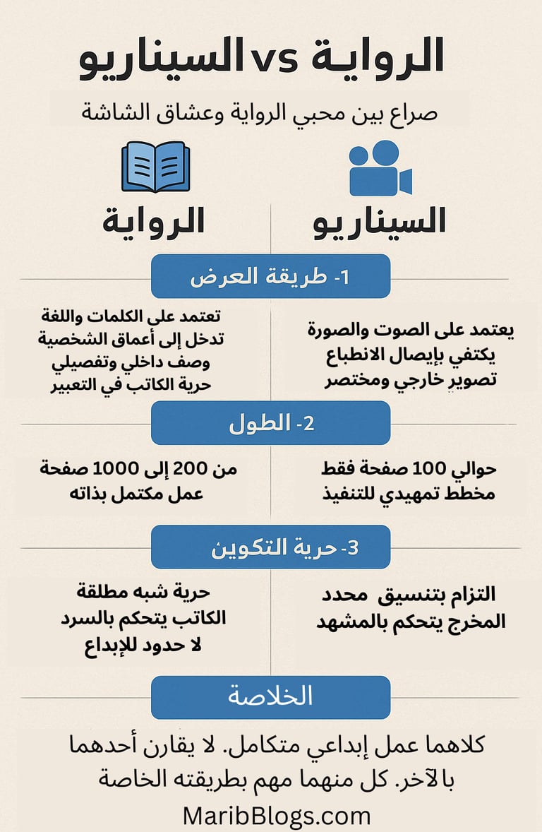 الرواية تمنحنا الخيال والعمق الأدبي، بينما يمنح السيناريو التجربة البصرية والسمعية. كلاهما فن مستقل لا يغني أحدهما عن الآخر، بل يكملان بعضهما.